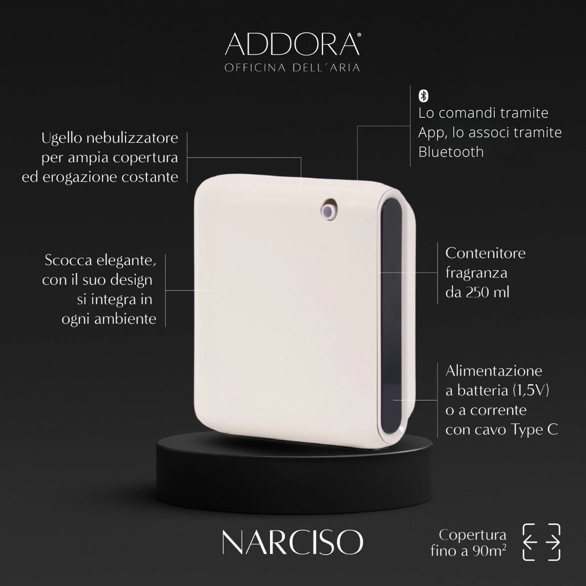 Narciso garantisce un’erogazione ottimale della fragranza, sia che venga alimentato a batteria o a corrente. Inoltre l'App in dotazione per IOS e Android (@Scent Marketing) permette di utilizzare la macchina con velocità, facilità e flessibilità sfruttando la più recente tecnologia Bluetooth.